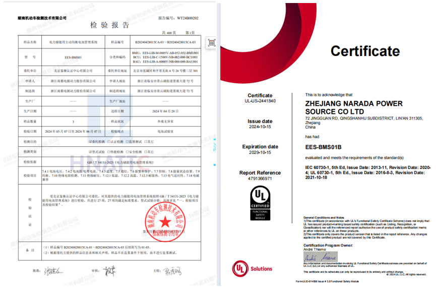 The BMS is an essential component for ensuring the safe and efficient operation of new energy storage systems. Recently, Narada Power’s newly developed 1500V liquid cooling active balancing BMS system for energy storage obtained the CGC type test report under GB34131-2023 and IEC/UL60730 functional safety certification reports and certificates, qualifying it for sale in domestic, European, and American markets.
